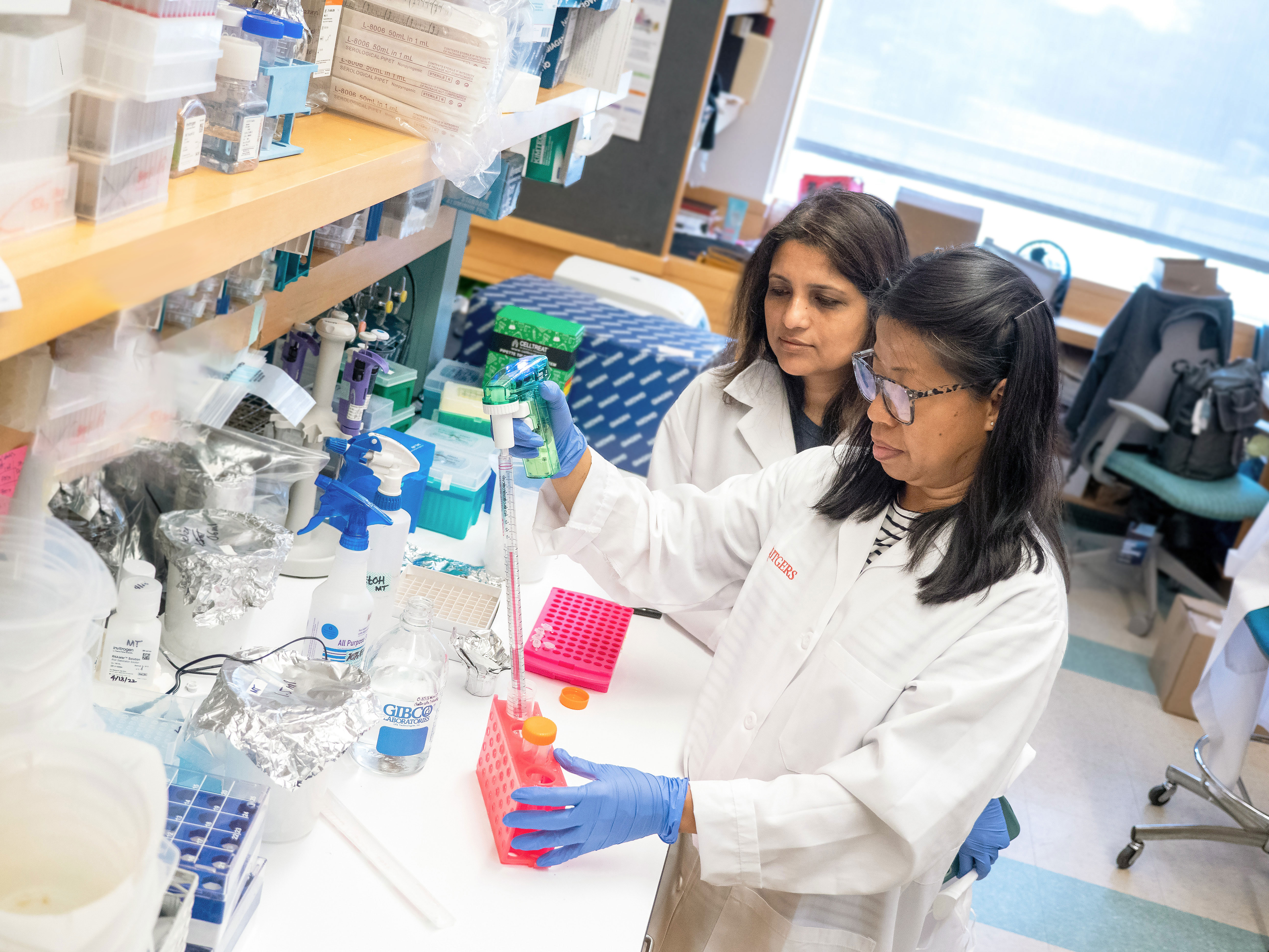 Researchers in white coats use a pipette in a microbiology lab