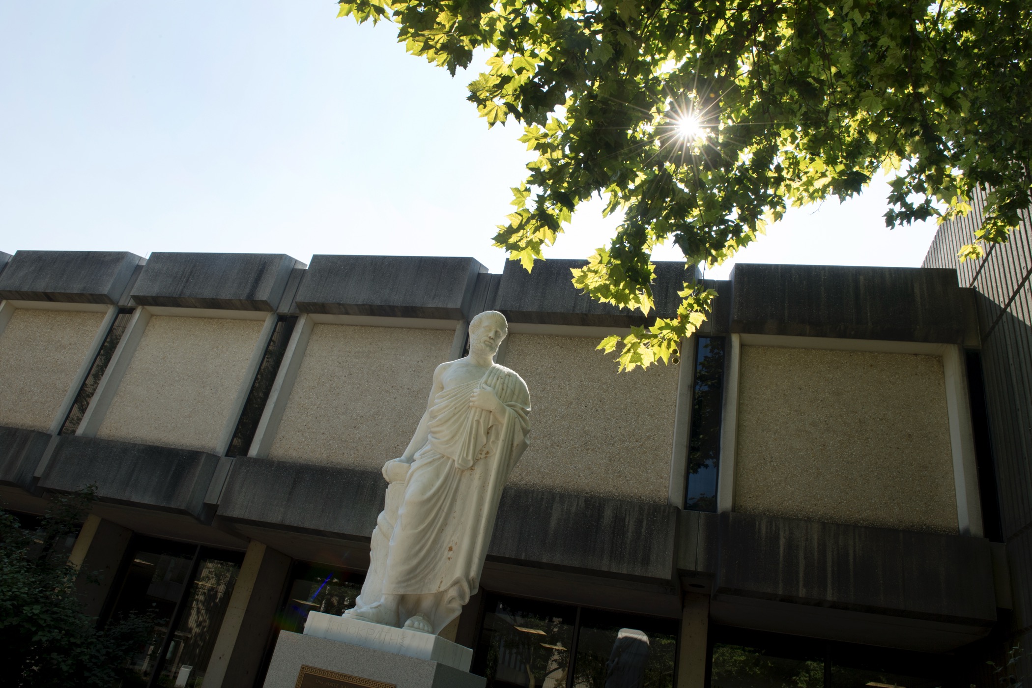 The sun shines through trees above a sculpture of Hippocrates outside the Robert Wood Johnson Medical School on Busch campus.