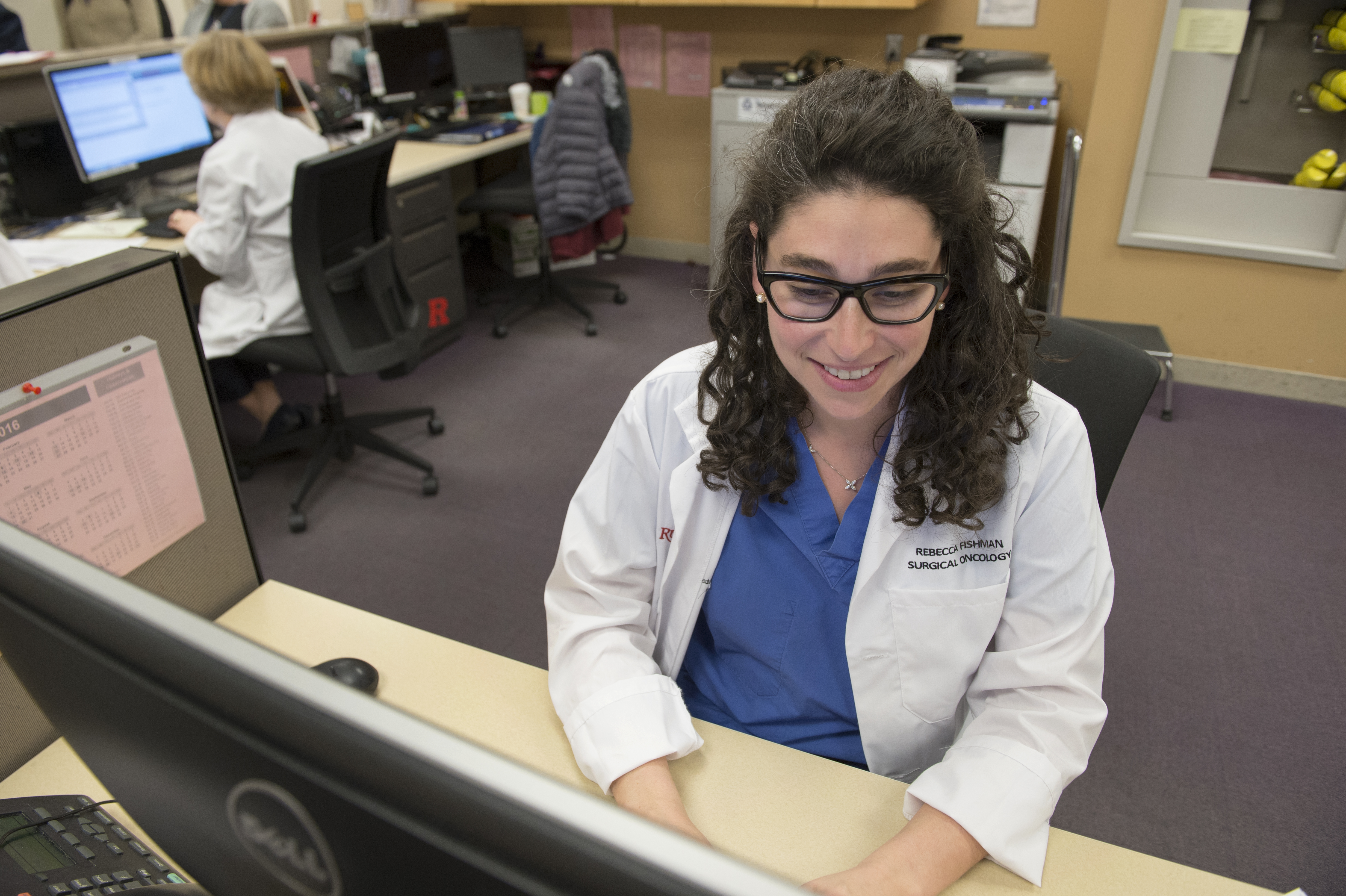 A surgical fellow works on a computer